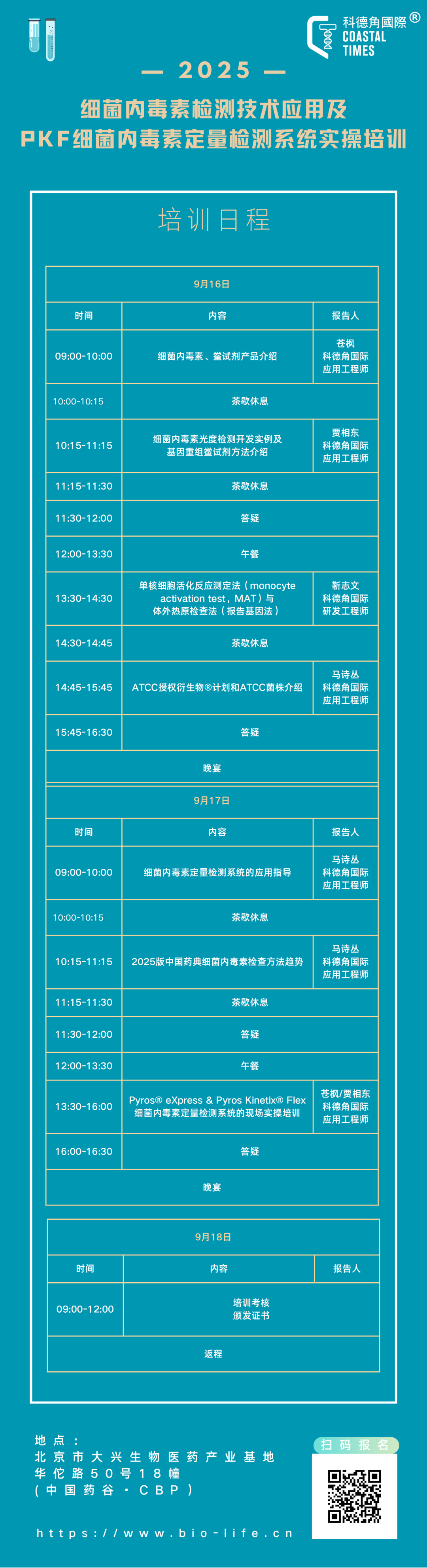 【概要描述】亲爱的行业伙伴们,金秋九月,科德角国际将为您奉上一场技术盛宴!2025年9月16日-18日,我们将在北京总部举办最新一期“细菌内毒素检测技术应用及PKF细菌内毒素定量检测系统实操培训”,现正式开启报名通道!