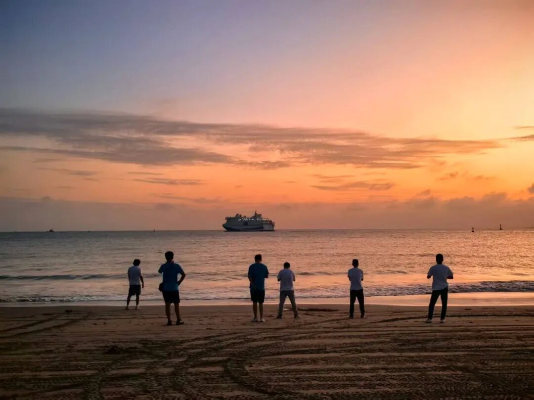 在棋子湾看日落被誉为最浪漫的事,这里能看到海南西边最美日落。夕阳的余晖洒在海面上,波光粼粼,仿佛撒下了一地的碎金。团队成员们驻足欣赏,用镜头记录下这难忘的时刻。这一刻,大家忘却了工作的疲惫,沉浸在自然的美景中,感受着“向往的生活”的真谛。